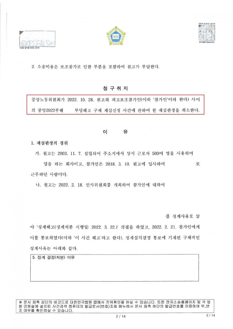 - 사건 : 서울행정법원 2022구합88064호 부당해고구제재심판정취소