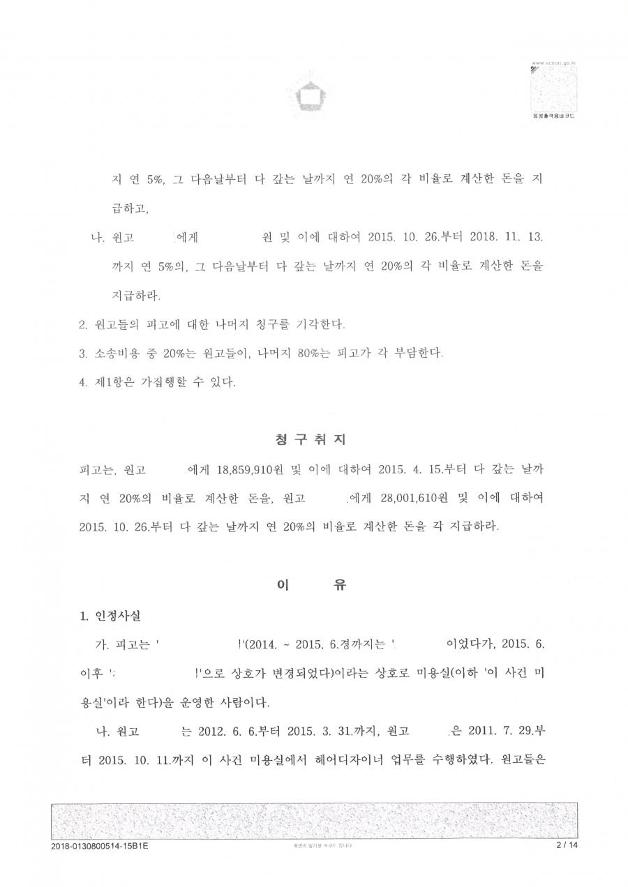 - 판결요지 : 미용실의 헤어디자이너로 근무한 원고들은 체불된 임금 및 퇴직금의 지급을 요구하고, 피고는 원고들과 자유 직원 소득업자, 프리랜서로 계약을 하였기에 원고들은 근로자의 지위에 있지 않다고 주장하는 바, 피고가 원고들의 근무일정, 휴가일정 등 근태관리를 하고 이를 지키지 않을 시 벌금의 납부를 규칙으로 정하였던 점, 고객응대에 대한 지시가 있었던 점, 분기별 작품 발표 요구, 매장 매출 올리는 방법에 대한 사례발표 요구 등 디자이너로서 개인의 능력에 따라 일을 하기는 하나 그 외 가격산정부터 매장 운영에 대해서는 피고에게 고용된 피용자로서 업무지시를 받았던 사안에 대해 입증함으로써 근로자 지위를 인정받아 체불된 임금 및 퇴직금을 인정받은 사례.